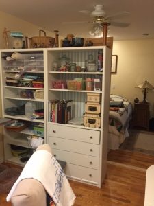 Before we moved, my sewing space shared the spare bedroom, which was long and rather narrow. I flipped the wall unit around and created a room divider which hid my mess and kept it from overflowing into the guest area.