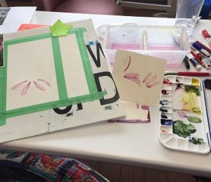 This particular exercise is a watercolour technique I’ve often used. But keeping with the idea of experimenting, we decided to see it if it would work with acrylics, as well. While the acrylic paint didn’t flow under the plastic wrap like watercolour, the paint still echoed the lines and forms created by the wrap on top. Definitely something to do again.